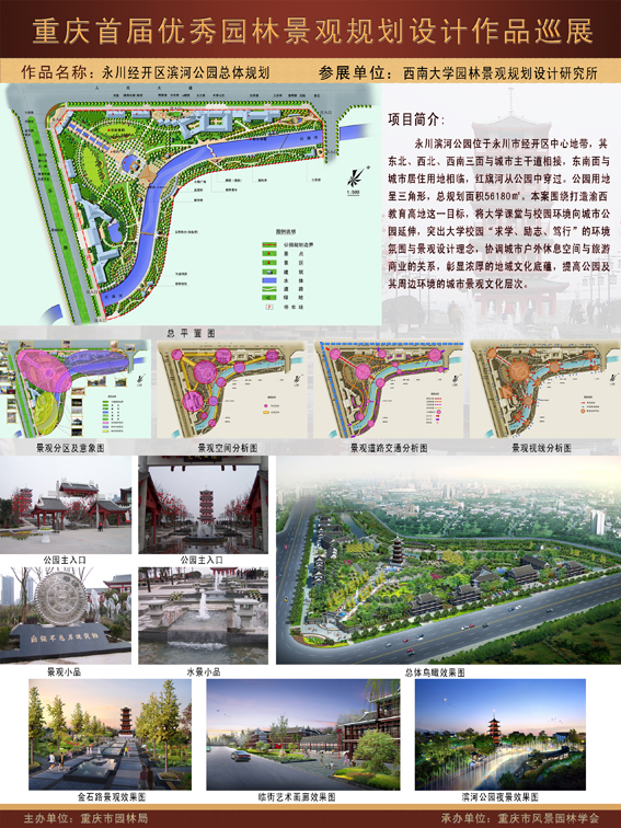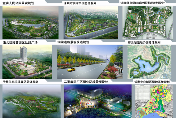 近期,該院主要設計研究人員主持規劃和研究的具有代表性的規劃設計有:榮昌縣海棠公園總體規劃、長壽中心城區綠地系統規劃、永川市濱河公園總體規劃、宜賓人民公園景觀規劃、彩云湖濕地公園總體規劃、巴南區中心城區綠地系統規劃、榮昌縣綠地系統規劃、涪陵師范學院新校區景觀規劃設計、巴南中壩島觀光農業總體規劃、銅梁道路景觀改造規劃、千秋村生態農業園區總體規劃、南山植物園溫室景觀設計、三峽水庫運行后對消落區生物多樣性和林木樹種的影響及對策等項目八十余項。