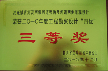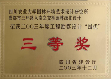 “成都市三環(huán)路人南立交橋園林綠化設(shè)計”、“漢旺鎮(zhèn)官河及西堰河道整治暨兩側(cè)景觀設(shè)計”項目獲省“四優(yōu)”三等獎;
