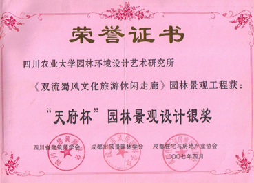 “綿竹市遵道鎮(zhèn)棚花村國家災(zāi)后重建重點(diǎn)項目”、“雙流蜀風(fēng)文化旅游休閑走廊”項目獲“天府杯”園林景觀設(shè)計銀獎;