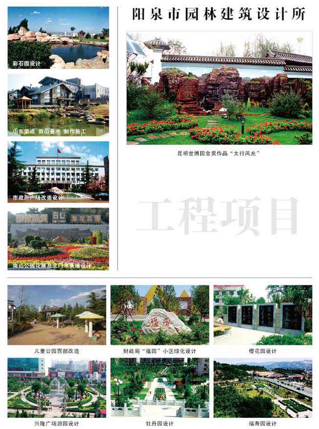 本所具有較強(qiáng)的園林規(guī)劃、設(shè)計(jì)能力,擁有各類專業(yè)技術(shù)人員,擁有先進(jìn)的技術(shù)設(shè)備、計(jì)算機(jī)輔助設(shè)計(jì)及管理系統(tǒng)。已承擔(dān)各類園林工程設(shè)計(jì)、園林綠化工程施工,主要有:昆明世博園“太行風(fēng)光”假山設(shè)計(jì)、制作,山東榮成博士后工作站假山疊水設(shè)計(jì)及施工,河曲新塘坪路綠化設(shè)計(jì)施工,陽(yáng)泉市櫻花園、牡丹園、海棠園、大陽(yáng)泉文化園、彩石園等各類游園的規(guī)劃設(shè)計(jì),陽(yáng)泉市區(qū)景觀提升設(shè)計(jì),以及輔助桃河工程建設(shè)、王母垴植物園建設(shè)、獅垴山公園等大型工程建設(shè)等。取得了良好的社會(huì)效益和經(jīng)濟(jì)效益。