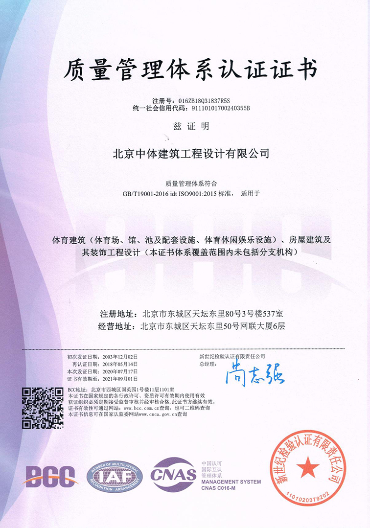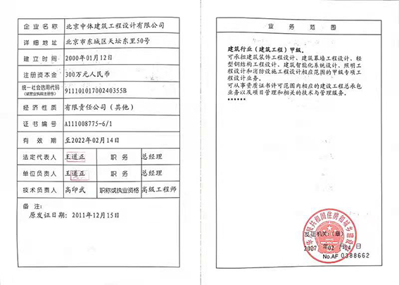 北京中體建筑工程設計有限公司是全國體育系統經建設部批準,具有建筑行業(建筑工程)甲級設計資質、體育工藝設計咨詢資質以及商務部批準的對外承包工程資質的設計單位,于2003年通過ISO9001質量認證,并于2011年獲得了由北京工程勘察設計行業協會頒發的誠信證書。公司主要從事體育建筑(體育場、館、池及配套設施,體育休閑娛樂)、民用建筑的設計、咨詢業務。其中,體育工藝專業代表國內的最高水準。
