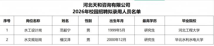 河北天和咨詢有限公司2026年度校園招聘擬錄用人員公示