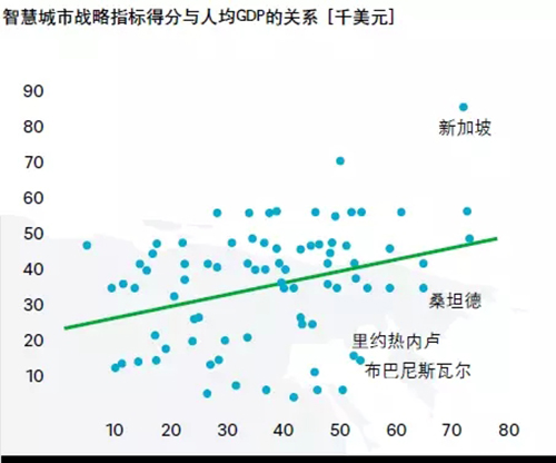 研究發現,雖然人們早已認識到智慧城市戰略對城市發展的重要性,多年來也一直將其納入城市發展議程,但涵蓋社會與城市生活各個方面的城市整體發展愿景規劃仍然缺位,實際情況與理想尚有差距。部分城市在某些特定領域幾乎毫無建樹,而能同時在三個維度上都獲得較高評分的城市更是屈指可數。 一般而言,城市的經濟表現與其在指數中的名次呈正相關關系,但富裕程度并非城市智慧戰略成功的先決條件,指數排名高低與城市規模也無直接關系。全面的、端到端的智慧城市戰略才是未來智慧城市的發展方向。城市中心需要開發一套互聯的、綜合的方案,將能源與出行、政府管理與醫療健康、教育與環境等過去一個個孤立的領域聯接起來,從而建立涵蓋市民生活各個領域的整體智慧城市戰略。 一般而言,越富裕的城市,其智能化戰略越出色,但GDP較低的城市也能創造出優秀的戰略。