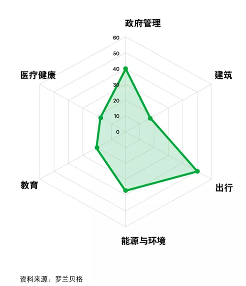 行動領域 在分析權重最高的“行動領域”這一維度時,報告發現,城市的智能策略往往都比較局限,缺乏全面性,只關注出行、能源、政府管理,而忽視教育、醫療健康和建筑等其他方面。 雖然數字化的交通系統、能源供應等不失為建設智慧城市的良好起點,但仍然需要謹記大局觀的重要性。增強城市對各種職能的協調能力是提高智能水平的一個關鍵,應設立專門的中央協調辦公室,避免不同職能部門開發并采用不同數字化方法的“孤島思維”。 智慧行動的重點領域:各城市更關注三大重點領域,其他三個領域則易被忽視 [每個類別中最高分數的百分比]。