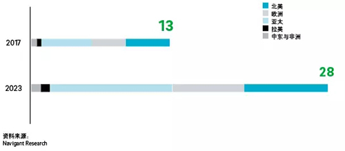 IT基礎設施 在本報告中,城市的IT政策和網絡互聯水平分別占該項評價指標的70%與30%。羅蘭貝格合伙人江浩認為,中國在智慧城市硬件基礎設施方面的投入非常可觀,效果顯著;未來,中國應著力于將軟硬件建設結合起來,促進城市整體數字化水平的提高。 智慧城市解決方案市場日漸繁榮,預計未來十年的全球市場容量年增長率為13%,從2017年的不到130億美元增至2023年的280億美元,釋放的市場潛力有望為企業創造巨大商機。其中,亞太地區市場的發展增速高于歐洲與美洲地區,預計將從最高每年16%提高至2023年的約32%。